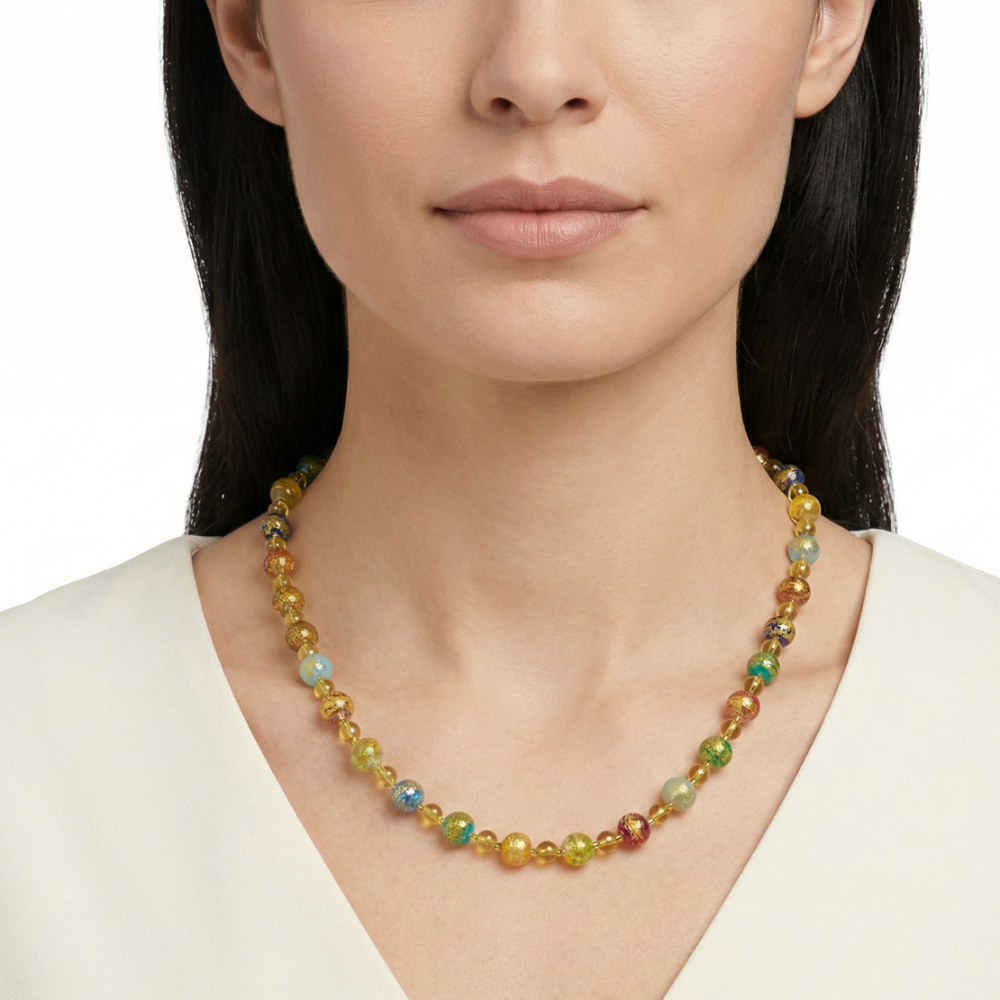 This beautiful handmade Murano glass necklace features handmade Murano glass beads, each one flaked with 24 carat gold foil in a stunning selection of colours.